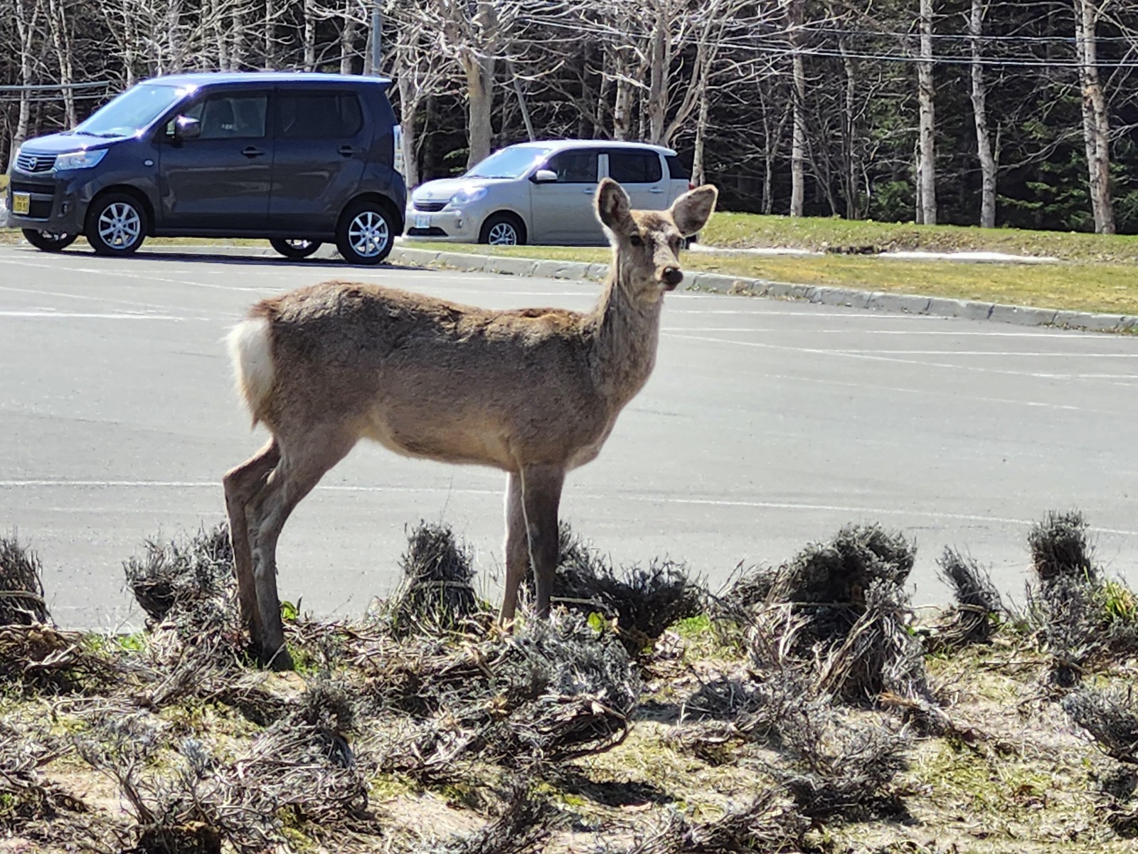 先日、出勤時に豊富温泉街の湯の杜ぽっけさんの前で🦌に遭遇。