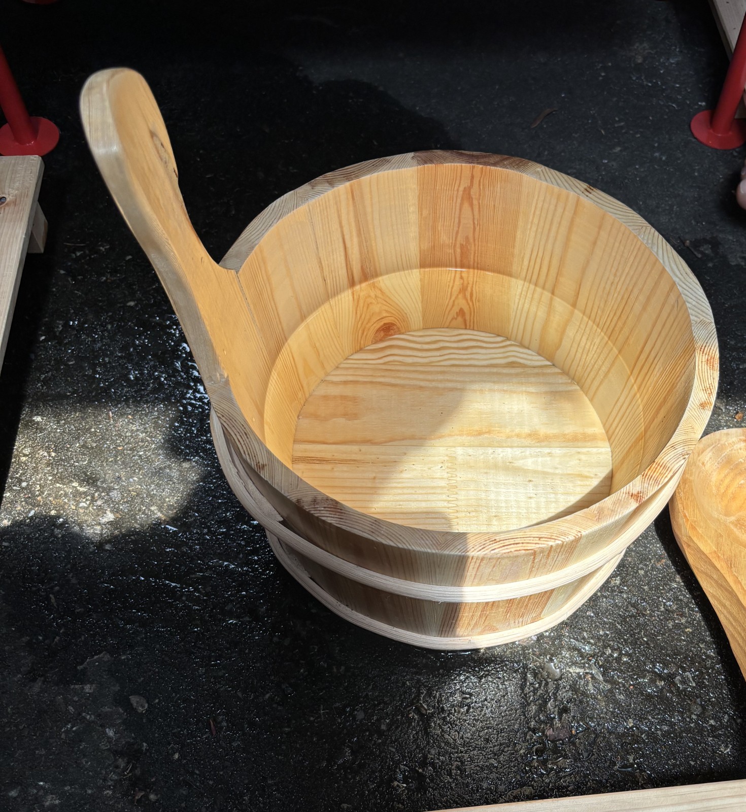 サウナには知り合い3人で入り、写真の桶を使ってせっかくなのでロウリュ(サウナの石に水をかけて蒸気を発生させて温度を上げること)をしてみましたが、とにかく熱くて誰よりも早く外へ出てしまいました笑