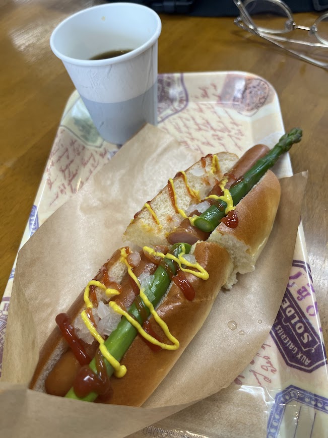 アスパラが1本丸ごと入っているホットドック&コーヒー