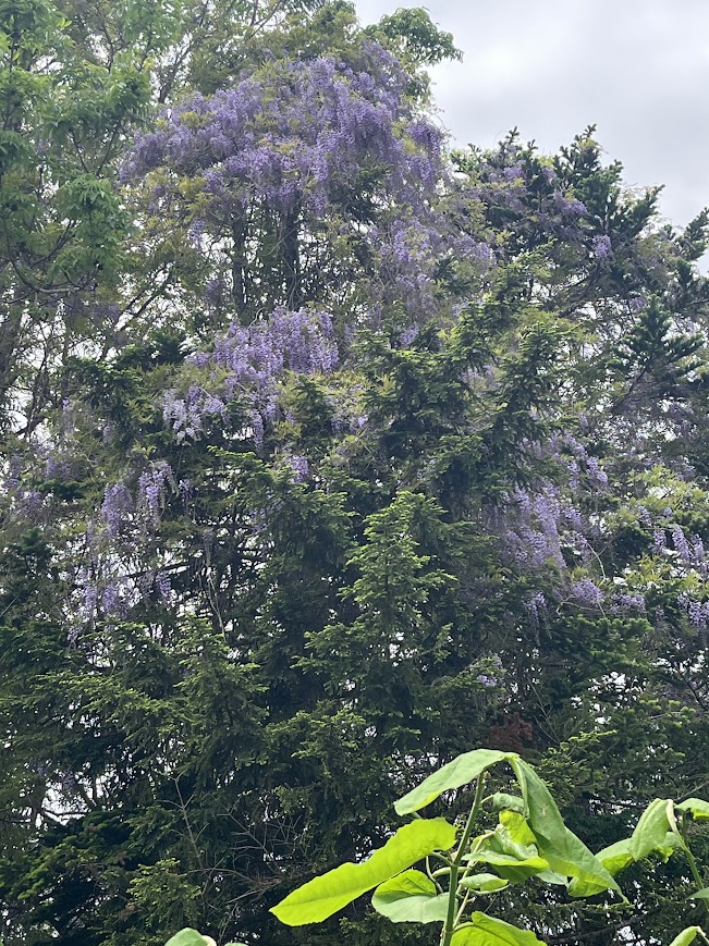 町内に大木にまきついているフジの花を発見。2階建ての家の屋根よりも高く