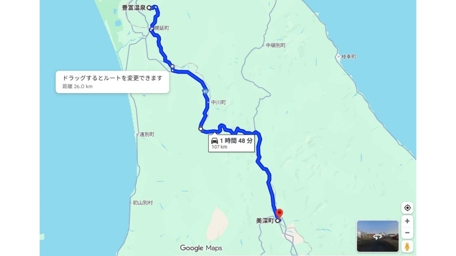 豊富温泉から南に約107km、車で1時間40分くらい離れた場所です。