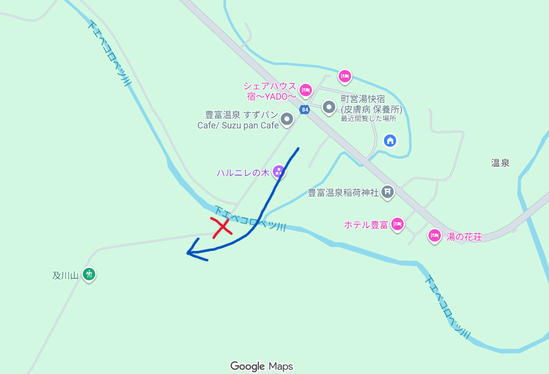 この画像の青いルートを行くのですが、今までで下エベコロベツ川を越えたこと(赤い×より先の道)は一度もありません。
