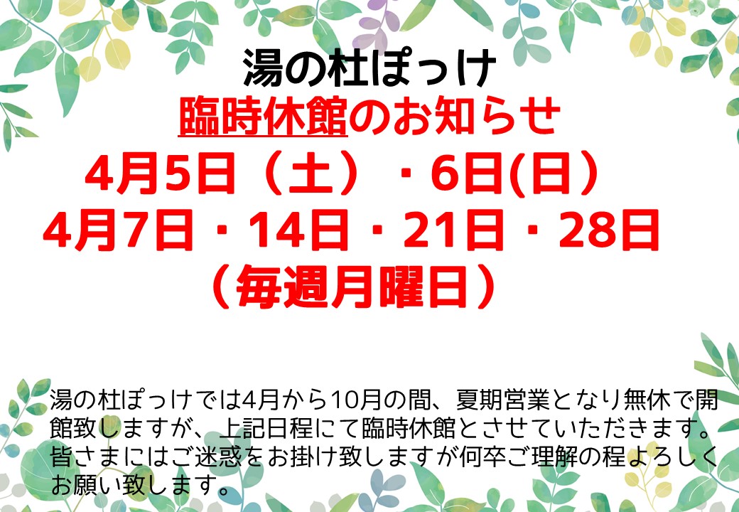【湯の杜ぽっけ】 4月の休館日のお知らせ お知らせ 2025 4 4 (金) ご迷惑をおかけいたしますが、ご理解のほどよろしくお願いいたします。 2025年4月 5日(土)・6日(日) 7日(月)・14日(月)・21日(月)・28日(月) を臨時休館とさせていただきます。 何卒ご理解のほどよろしくお願いいたします。 ツイート