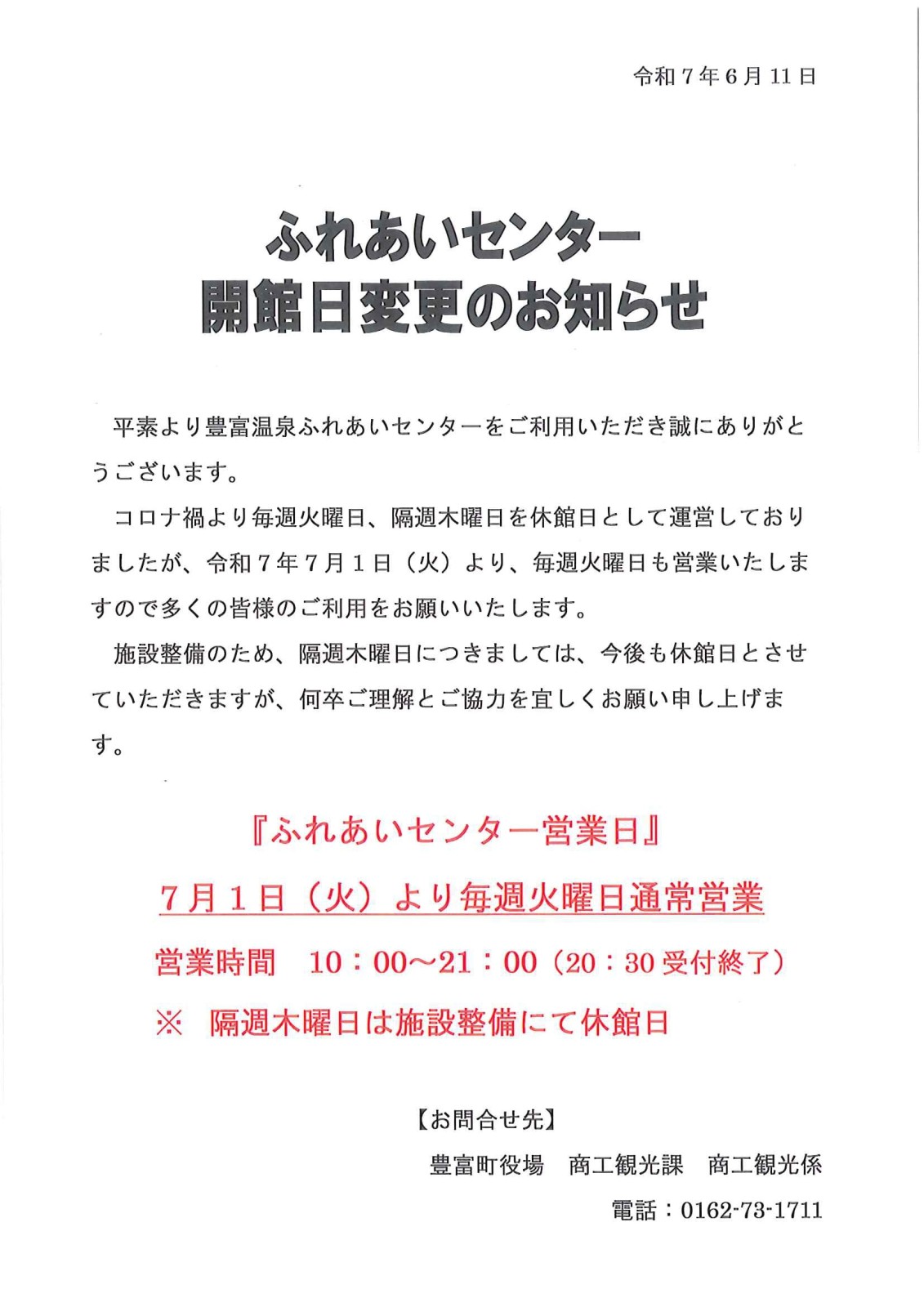 平素より豊富温泉ふれあいセンターをご利用いただき誠にありがとうございます。