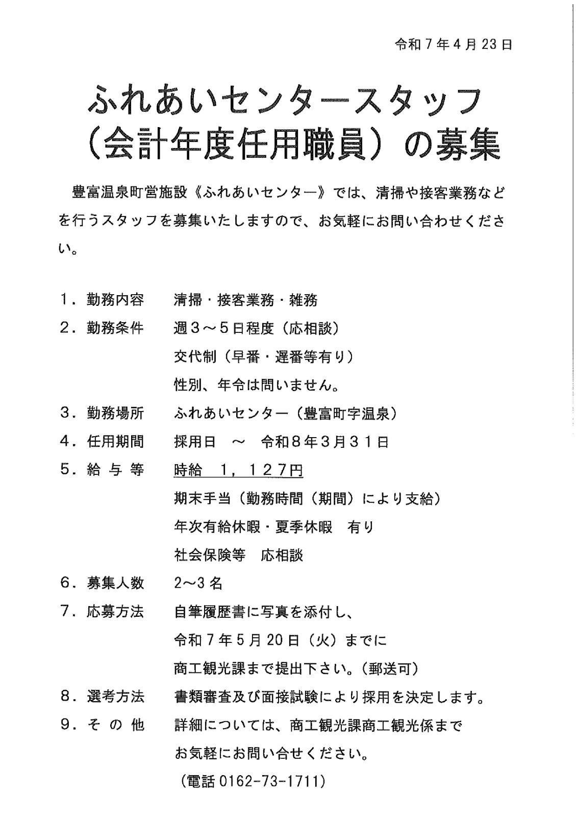 豊富温泉 町営日帰り入浴施設<ふれあいセンター>では清掃・接客業務・雑務を行うスタッフ(パートタイム会計年度任用職員)を募集しています!